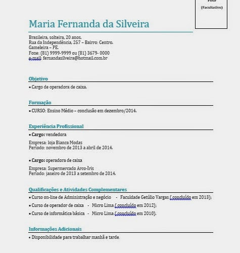 OBS: Use a fonte Arial 11. Se você não tem experiência profissional, escrever sobre os cursos que fez é uma forma de valorizar seu currículo.